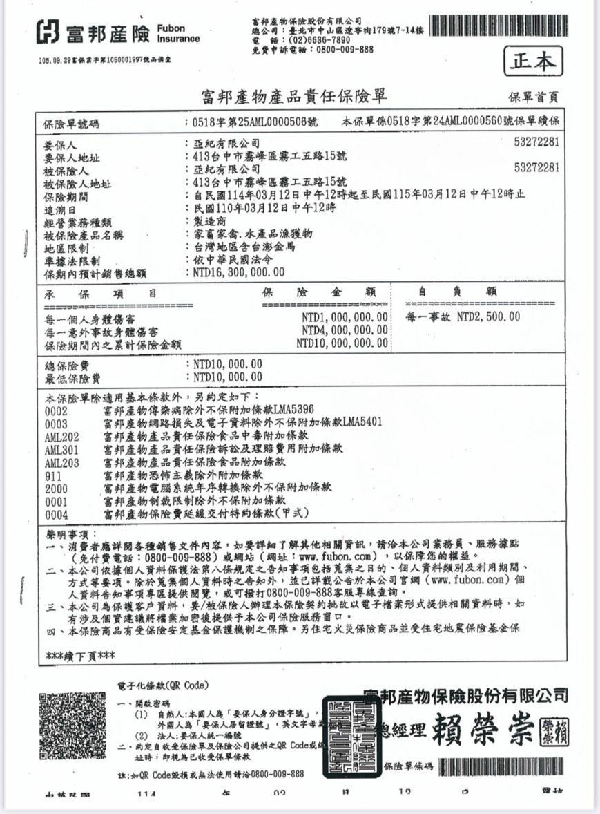 亞紀有限公司專注於提供高品質的冷凍水產,我們的產品經過嚴格把關,以確保新鮮與安全。作為業界的先驅,我們了解消費者對食品安全的重視,因此我們已投保保富邦產物的產品責任保險,為客戶提供全面的保障。歡迎隨時聯絡我們,讓我們為您提供最佳的冷凍食品解決方案。